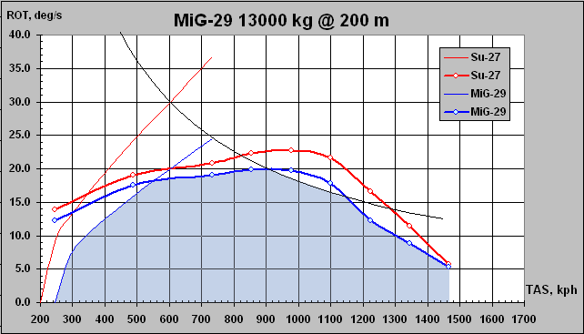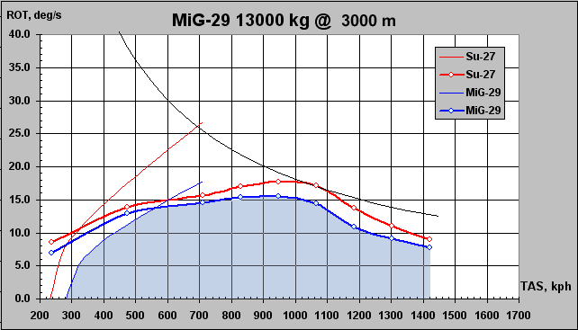 Rate of turn for MiG-29 in comparison with Su-27. Data from Lock On.
