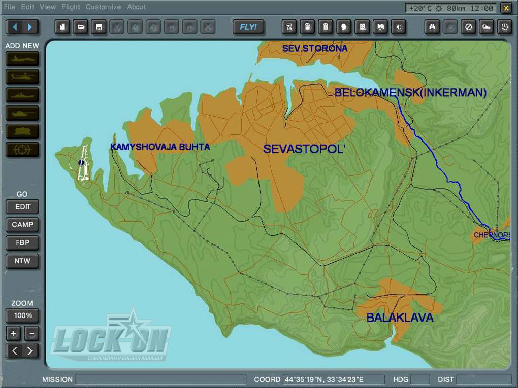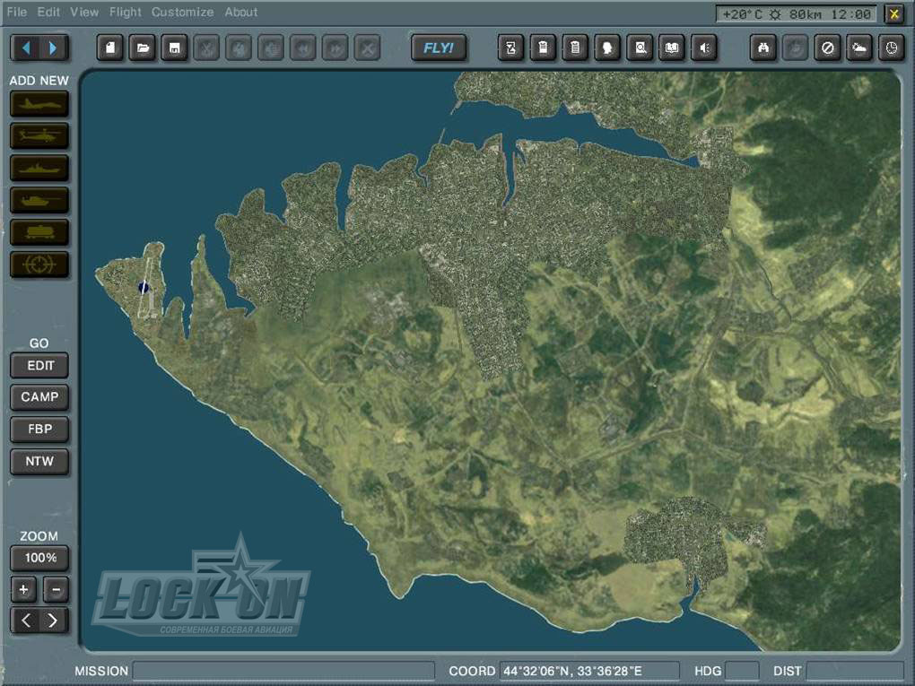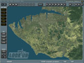 Using this information and a height elevation map, a 3D landscape with a network of roads, rivers, and population centers is generated. The whole terrain is then textured. Satellite images and airborne photographs, combined with a program for automatic texture generation, is used for this purpose. Different objects such as houses, trees, power lines, ports, and military installations are positioned on the terrain manually and automatically. After that, all the locations are downloaded into the internal format of the simulator. Here is what a completed terrain in the Lock On mission editor looks like.