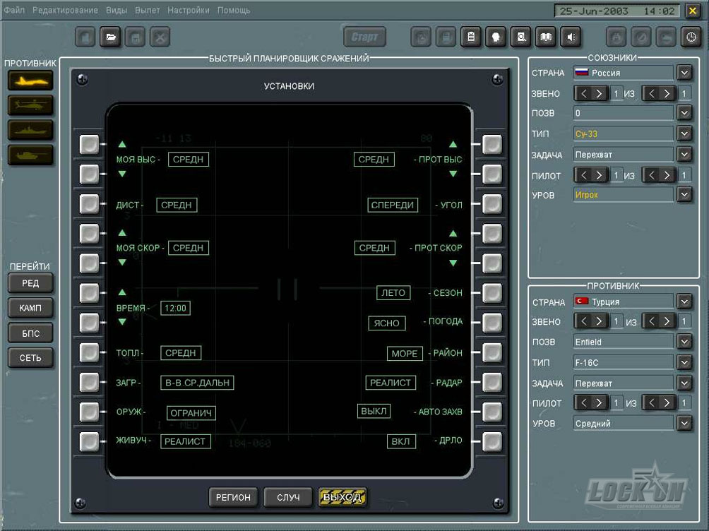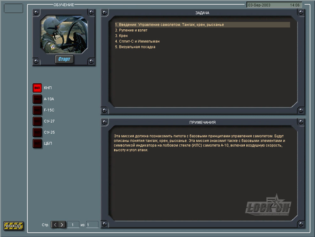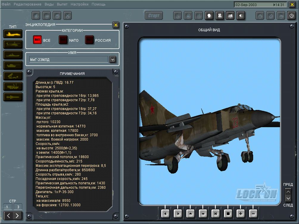 The Encyclopedia allows the user to look through all the aircraft, helicopters, tanks and armored carriers, cars, SAM and antiaircraft systems, radars, and weapons included in Lock On. In a separate window, the player can study the characteristics of these systems.