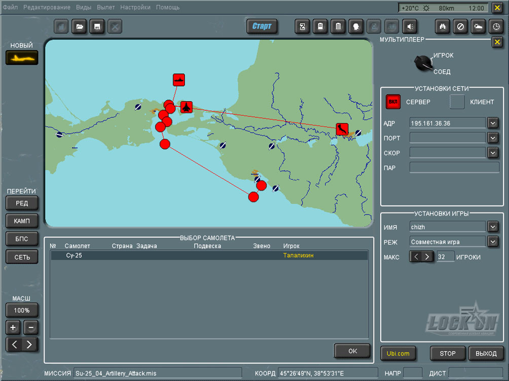 This mode allows players to fight cooperatively against AI-controlled enemies, or fly head-to-head against each other via a LAN or over the Internet. At the start of a session, the player can choose their coalition, and after downloading the mission, choose an aircraft. With the help of on-line chat, the player can communicate with the other players in their coalition.