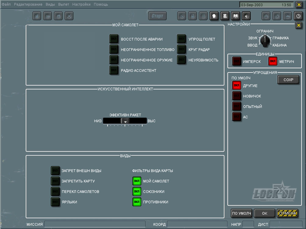 This menu allows players to customize Lock On: Modern Air Combat to the requirements of their system and choose custom settings of game realism. In the upper right-hand corner of the screen is a dial with five selections: Input, Audio, Difficulty, Graphics, and Cockpit.